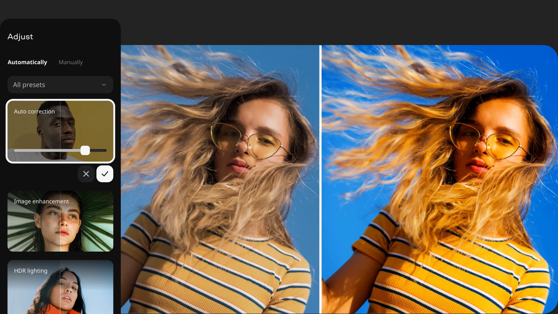 One click and your photo is ready to share – let AI fix light and colors to make every detail stand out.